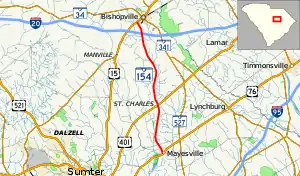South Carolina Highway 154 (SC 154) is a 16.680-mile-long (26.844 km) state highway in the U.S. state of South Carolina. The highway connects Mayesville and Bishopville.