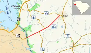 South Carolina Highway 181 (SC 181) is a 6.430-mile-long (10.348 km) state highway in the U.S. state of South Carolina. The highway connects the Georgia state line with Starr.
