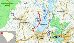 SC 188 begins at an intersection with SC 28 (Blue Ridge Boulevard) northwest of Seneca, within Oconee County, where the roadway continues as Bountyland Road. It travels to the north-northwest and then curves to the northeast just before passing Oconee Christian Academy. It crosses over Cane Creek on the McMahan Bridge. Just south of White Harbor, it crosses over part of Lake Keowee on an unnamed bridge. North of White Harbor, it passes Keowee Elementary School. East-northeast of Walhalla, the highway meets its northern terminus, an intersection with SC 183.[2]