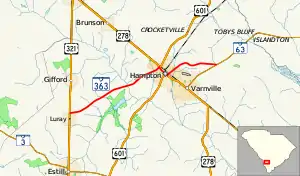 South Carolina Highway 363 (SC 363) is a 13.270-mile-long (21.356 km) state highway in the U.S. state of South Carolina. The highway is designated on an east–west direction, from U.S. Route 321 (US 321) in Luray to SC 63 just outside Varnville.