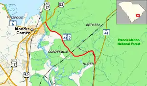 SC 402 is a two-lane rural road that begins at U.S. Route 52 (US 52) and U.S. Route 17 Alternate (US 17 Alt.) near Moncks Corner; per the South Carolina Department of Transportation, SC 402 ends at the pair of U.S. Highways though signage on US 52/US 17 Alt direct travelers "to" SC 402.[1][2] From there, it goes east, through Cordesville and by the Huger Recreational Area. At Huger, it ends at SC 41. Because it traverses mostly in or along Francis Marion National Forest, majority of the route is forested.[2]