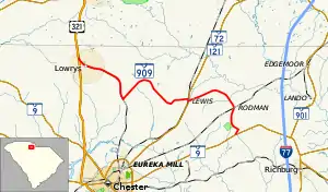 SC 909 is a two-lane rural highway that traverses from U.S. Route 321 (US 321) in Lowrys to SC 9 near Richburg. The route zig-zags in northern Chester County connecting small communities, and provides access to the Chester Catawba Regional Airport.[2][3]
