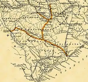 In 1840, the company constructed a 66.3-mile (106.7 km) railroad line between Branchville and Columbia, South Carolina,[3] and in 1848, the South Carolina Rail Road Company constructed a 37.1-mile (59.7 km) railroad line between Kingsville[6] and Camden, South Carolina.[3] In 1853, the company constructed a 1.8-mile (2.9 km) railroad, mainly a bridge over the Savannah River, from Hamburg, South Carolina, to Augusta, Georgia.[3]