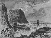 On Monday 12 February 1855 large portions of the sea wall were washed away. Despite repair work starting promptly four days later more of the sea wall and a long 70 yards (64 m) section of line were also washed away.[9] Passengers were obliged to leave their trains and carry their luggage some distance to join another.[10] A temporary viaduct was constructed by the resident engineer, Mr. Margery, and was in operation within a couple of weeks which allowed the through operation of coaches, pulled by hand and rope, although some nervous passengers still alighted and walked.[11]