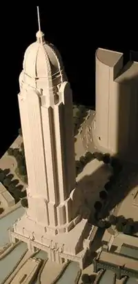 The South Ferry Plaza, also called A Lighthouse At The Tip Of The Island,[2] was a supertall skyscraper proposed in 1987[3][4] to rise right next to the East River on Manhattan Island in New York City.[1] The building would have sat on top of the South Ferry terminal and tower 1,084 ft (330 m) above street level, with 60 stories of office space.[2] It was designed by architect Fox & Fowle Architects and Leslie E. Robertson Associates.[1] The architects designed the building for office use and the skyscraper incorporated recycled marble and steel with glass in its structure. The architectural plan had a glass dome that was supposed to be lit at night, which also contained an observation deck and three restaurants located inside the dome.[2] In addition, the project called for the renovation of the South Ferry Terminal, including the train station so it can accommodate 100,000 people. The project would have doubled the size of Battery Park if it had proceeded, since the building included a plaza that was planned to tie in with Battery Park via a new promenade at the tip of Manhattan.[2] The project was canceled in 1991 because of a lack of funding.[5]