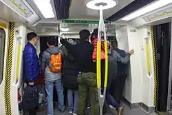 MTR defines the railway as a medium capacity system. The final order for rolling stock for the new line consisted of 10 new three-car MTR CNR Changchun EMUs using steel wheels. These trains are externally similar to the new existing sets in service on the Kwun Tong line, but are fully automatic and driverless – the second such line in the MTR system after the Disneyland Resort line, and the third such line in Hong Kong.[5] However, every train has at least one staff for patrol in the traffic hour who is qualified to control the train manually according to the requirements of the Fire Services Department since the commencement of the line.[6] Trains operate with a frequency of three minutes during rush hour.