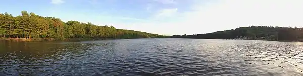 Orange Reservoir is a reservoir located in the reservation's northern tract. Within the borders of West Orange, it is owned by the City of Orange and operated and maintained under contract with United Water. It was originally developed during the intense urbanization of northeastern New Jersey in the late 19th century, drawing from the Rahway River.[7] The man-made lake is no longer part of the water-supply system and since the late 2000s (decade) various proposals have been made to allow its use as a recreational resource as part of the Recreational Complex. The complex abutting the reservoir includes a miniature golf course,[8] and a boathouse-restaurant opened in 2011.[6] Proposals were complicated by the fact that while owned by one municipality, it lies within the borders of another, and it is unclear whether it is taxable.[9] Offers by the Essex County Park System to buy or lease property were put in place as a possible resolution.[10] The county was able to reach an agreement to lease the reservoir from the City of Orange until 2032.[11] In November 2013 it was announced that bridges and other improvements for recreational use would be made.[12][13]