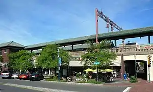 The western end of the platform for tracks 1 and 3 and the eastern end of the platform for track 2 contain high-level sections of platform. Installed in 2004, these allow those with handicaps to board and bring the station in compliance with ADA regulations.[10] There are a number of retail stores at street level, below the station building. As of 2022, these stores are Cait & Abby's Bakery, Starbucks, Super Cuts, On the Track Cleaners, Cold Stone Creamery, and Village Diner.