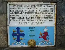 In 1807, an octagonal belfry was added to the steeple and, in 1817, a plaque and a fountain were unveiled on the stairway up to the steeple to commemorate the contribution by Archibald Primrose, 4th Earl of Rosebery who had provided a bleachfield and a water supply for the town.[3] In 1888, clock faces were added to commemorate the Golden Jubilee of Queen Victoria, an innovation which the historian, Thomas Scott Muir, regarded as having "disfigured" the steeple.[7]
