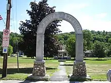 The park also features a fountain at the center of the park (originally a two-tier cast iron fountain), a cannon, a granite Civil War statue, and a granite memorial to Royalton residents who served in the World Wars, Korean War, and Vietnam War. The largest memorial is a stilted granite arch, the Handy Memorial (1915), commemorating Hannah Hunter Handy who rescued nine children following the Royalton raid. Other features of the park include paths bisecting the lawns regularly, intersecting at the fountain, trees at the park's borders and interspersed, and wrought-iron benches.[2]