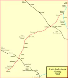 At the same time, another company, the Trent Valley, Midlands and Grand Junction Railway was authorised.[11][12] It was to make a line from Walsall northwards through Lichfield to join the Midland Railway main line (heading towards Burton-on-Trent) at Wichnor. It too was authorised on 3 August 1846, with capital of £420,000. The two companies had been in discussion and saw there were advantages in combining, and this was allowed for in their respective Acts. Final agreement for this was accomplished on 6 October, ratified by an Act of 9 July 1847. The 1847 Act also confirmed a change of name for the combined company, which was to be called the South Staffordshire Railway; the combined share capital was fixed at £945,000; in addition the Act granted running powers over the Midland Railway from Wichnor Junction to Burton.[8][13]