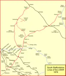 The South Staffordshire Railway (SSR) was authorised in 1847 to build a line from Dudley in the West Midlands of England through Walsall and Lichfield to a junction with the Midland Railway on the way to Burton upon Trent, with authorised share capital of £945,000. It was supported by the newly-formed London and North Western Railway (LNWR) and the Midland Railway, giving each company access to important areas. It completed its main line in 1849. As collieries in the Cannock region rose in importance, it built a second main line from Walsall to Rugeley, as well as numerous short spurs and connections to lines it intersected. Colliery working in the Cannock area expanded enormously, and mineral traffic carryings increased in step.