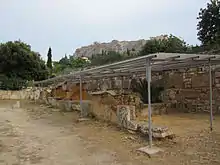 The South Stoa I of Athens was located on the south side of the Agora, in Athens, Greece, between the Heliaia and the Enneakrounos, a southeastern fountain house. It was built around 425–400 BC (during the Classical Era). The stoa was in use until c. 150 BC, when it was replaced by South Stoa II (of Athens).