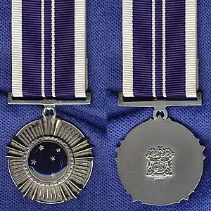 The Southern Cross Medal of 1975 is struck in silver, to fit in a circle 38 millimetres in diameter, and is 3 millimetres thick at the centre. It depicts the stars of the Southern Cross against a dark blue enameled background, on a framed roundel in the centre of a starburst of radiating points.[2]