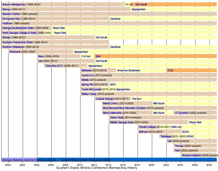 - 2017 - Two institutions left the SSAC to join their respective new home primary conferences: Brenau to join the Appalachian (AAC) and Coastal Georgia to join the Sun Conference, both effective after the 2016–17 academic year.