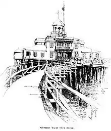 The seventeen years of the American Civil War and Reconstruction greatly curtailed boating activities until 1878 when the club was reorganized and its first postwar regatta held.[12] The following year, a handsome clubhouse was built over the water.[13] It became the scene of many elaborate social events as well as sailing competition.[14] In 1899 a new and larger clubhouse was erected under the leadership of Commodore Albert Baldwin. Regattas continued annually on the lake with the fleet competing each summer in interclub races on the gulf coast.