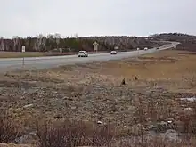 The Southwest Bypasses begin at an interchange with Sudbury Municipal Road 55, with Highway 17 continuing west towards Whitefish beyond the interchange. The four lane divided freeway immediately narrows to a two-lane road as it makes a broad turn from the southeast to the northeast and crosses Junction Creek.[2][3] A 100-metre right of way was designated in the 1970s for expansion of the Southwest Bypass to four lanes at a future date.[4] The route intersects Fielding Road north of the community of Mikkola as it continues curving northeast. It passes Fielding Memorial Park and bird sanctuary before travelling alongside the south shore of Kelly Lake. It makes another broad turn to the southwest, intersecting Southview Drive midway through the curve.[2][3]
