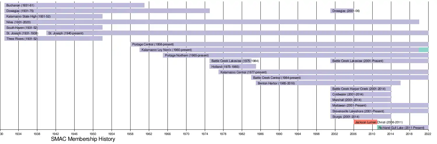 After the 2019-20 school year, founding member Niles will leave the SMAC after 89 years, joining the BCS Conference beginning in 2020-21.[2] Also, Loy Norrix will leave the SMAC in football only, remaining a member in all other sports. [3]