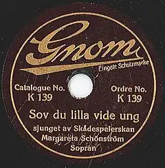 - ↑ Sov du lilla vide ung; Gud, som haver barnen kär, sung by actress Margareta Schönström, soprano. Stockholm: Skandinaviska Polyphon. May 1925. Accessed 9 August 2011.
