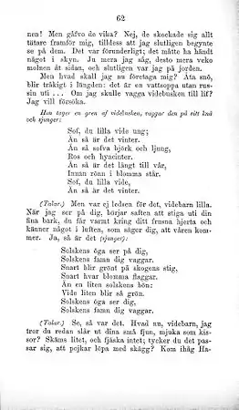Stormen och Solskenet has three roles, all intended to be played by children. The game begins with set design guidelines: "The playroom represents a country road going through a forest. It is early spring; the snow is melting, and birds are singing." A bit further into the text Sunshine says: "Could I bring the willow bush to life? I want to try." She takes a branch of willow bush, rocks it on her knee and sings:[1]