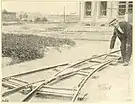 The Dolberg works in Rostock improved the Spalding system by using metal tie rods and by omitting the narrow wooden sleeper at one end of the panel. To secure the butt joint, the rails were hooked onto a metallic sleeper at one end. One rail was provided with a hooked tab which engaged around a metallic tie rod at the end of the other rails. Th joint could only be taken apart by lifting the opposite end of the frame (Figures 19 and 20).[3] The easy disassembly allowed other traffic to cross easily at level crossings by simply lifting one or two sections from the rail line.