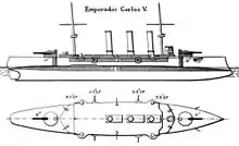 Emperador Carlos V was built at the naval shipyard at Cadiz, Spain, the largest ship built in Spanish yards in this era.[1] She was laid down in 1892, launched on 13 March 1895, and completed on 2 June 1898. She was the only member of her class. Her boilers and machinery were of Spanish construction, her armor German, her stern and stern post British, and her gun turrets, which were installed at Le Havre, France, in 1897, were French.[1] She had three funnels and was weakly armored, relying mostly on her armored deck for protection. Her 11-inch (280 mm) main guns were mounted fore and aft in centerline hooded barbettes.[2] One of her strengths was considered to be her great steaming range.[3]