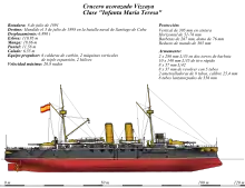 Vizcaya was built at Bilbao, Spain. She was laid down in 1889, launched on 8 July 1891, and completed in 1893.[1] She had two funnels and was fast and well armed. Her main armament was mounted on the center line in single barbettes fore and aft. Her armor was poor: her 11-inch (279 mm) guns had only lightly armored hoods, her 5.5-inch (140 mm) guns were mounted in the open on the upper deck, her armor belt was thin and protected only two-thirds of her length, and she had a high, unprotected freeboard that took much damage during the Battle of Santiago de Cuba. Like other nineteenth-century warships, she was heavily furnished and decorated with wood, which the Spanish failed to remove prior to combat and which would feed fires during the battle.[2]