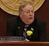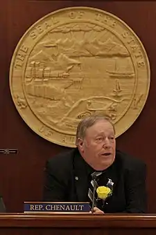 Mike Chenault is the longest-serving speaker, holding the office for four terms from 2009 to 2017. He is shown seated at the speaker's chair at the start of the 29th Legislature in January 2015. A large wood carving depicting the state seal hangs on the wall behind him.
