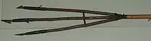 Spear fishing is an ancient method of fishing and may be conducted with an ordinary spear or a specialised variant such as an eel spear[8][9] or the trident. A small trident-type spear with a long handle is used in the American South and Midwest for gigging bullfrogs with a bright light at night, or for gigging carp and other fish in the shallows.