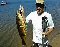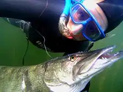 A common carp shot with a band-powered speargun by a diver using snorkelling gear, Minnesota, US