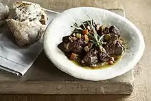 Spezzatino is an Italian stew, made from low-grade cuts of veal, beef, lamb or pork.[1][2] There are many regional variants. For example, in Tuscany is prepared a famous variant made with beef, carrots, celery and onions.,[1] in Umbria are traditional the spezzatini di montone (mutton)[3] and roe,[1] in Nuoro wild boar spezzatino is traditional,[1] whereas in Friuli Venezia Giulia spezzatino is served with aromatic herbs and dry white wine.[1]