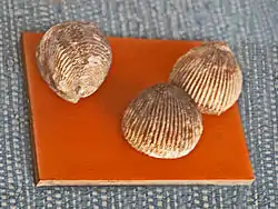 Fossil of Sphenorhynchia plicatella from France, on display at Galerie de paléontologie et d'anatomie comparée in Paris