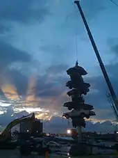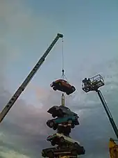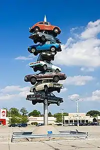 It was originally commissioned by the shopping center developer and owner, David Bermant, a collector of modern art who also donated his BMW car to be placed second from the top of the sculpture.[4] Shuler himself owned the red 1967 VW Beetle that crowned the sculpture.[5] The foundation of the sculpture reached nearly 30 feet into the ground; the cost of erecting it was over $75,000.[6] The sculpture has been featured in the film Wayne's World, on the cover of a book,[7] on postcards, state tourist brochures, and maps. On August 28, 2007, it was featured in the syndicated comic strip Zippy the Pinhead.[8]