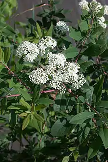 This plant is a shrub growing one to three meters (3โ€“10 feet) tall. It is clonal, with several cloned individuals growing in clumps. The leaves are variable in shape and size and may have smooth or toothed edges. The inflorescence is a dense corymb of many cream-white flowers, each flower about 0.6 centimeters wide. The fruit is a follicle. Flowering occurs in June and July. Though the plant produces many flowers, it rarely reproduces sexually and rarely produces seeds. Instead, it reproduces vegetatively by cloning, producing many new sprouts which grow into shrubs.[5] There are fewer than 30 genotypes in total, meaning there are fewer than 30 individual sets of genes; all the other plants are clones of one of the 30 types.[1]