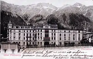 Despite growth in tourist numbers, there are suggestions that the pace of new hotel construction at times outstripped demand. In 1890 there were 1,200 recorded hotel beds in Pontresina. That increased to 1,530 in 1900 and 1,850 in 1910.[23] Significant new openings included that of the "Hotel Schweizerhof" in 1905[24] and of the "Hotel Palace" (today the "Hotel Walther") in 1907.[24] 1908 saw the expansion of the hitherto insignificant, in capacity terms, "Hotel Enderlin", which was relaunched as the "Schlosshotel Enderlin" with a new structure that incorporated an arrestingly eye catching tower.[24] The last significant new hotel in Pontresina before war broke out in 1914 was the "Hotel Rosatsch",[24] built on the plot directly beside the Hotel Pontresina. With their fashionable new architecture - whether inspired by gothic castles or by more homely alpine chalets - and integrated modern facilities, these newly built hotels enjoyed a competitive advantage over the establishments built or extended back in the 1890s.