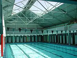 Lightweight steel trusses span the full width of the swimming hall, resting on engaged brick piers. The roof has been reclad, and while the original roof fully covered the swimming hall, a large central portion of the roof is now open to the sky. The steel trusses appear to be original.[1]