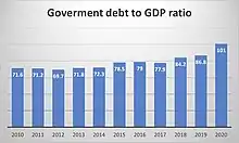 Sri Lanka's foreign debt increased substantially, going from US$11.3 billion in 2005 to $56.3 billion in 2020.[41] While foreign debt was about 42% of the GDP in 2019,[42] it rose to 119% of its GDP in 2021.[41] By February 2022, the country had only $2.31 billion left in its reserves, yet faces debt repayments of around $4 billion in 2022, which also includes a $1 billion international sovereign bond (ISB) maturing in July.[43][44]