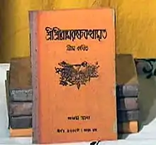 The pre-history of the Kathamrita has been discussed in R.K.Dasputa's essay (Dasgupta 1986).[8] The first volume (1902) was preceded by a small booklet in English called A Leaf from the Gospel of Sri Ramakrishna (1897).[8] After the death of Ramakrishna, the growing public recognition would have encouraged Gupta to make his diary public. M thought that his was an important medium for public dissemination of Ramakrishna's ideas. M also sought Sarada Devi's appraisal before the publication of the dairy.[9] Between 1898 and 1902, transliterated excerpts from his diary were published in leading Bengali journals like Bangadarshan, Udbodhan, Hindu Patrika, Shaitya Patrika and Janmabhumi.[9] The first four volumes were published in 1902, 1904, 1908 and 1910 respectively and the fifth volume in 1932, delayed because of M's health problems.[10] At the time of M's death in 1932, he was contemplating at least six to seven volumes, after which he hoped to rearrange the entire material chronologically.[6][10]