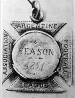 The first championship started on 12 April and finished on 13 September 1891. At the end of the season, St. Andrew's and Old Caledonians, a team formed by employees of the Scottish company that built the main drainage of Buenos Aires,[4] shared the first position and the Association considered the title shared, but both teams had to play a new match only to award the medals.[5] Therefore, St. Andrew's and Old Caledonians played a new game, played on September 13, 1891, and won by St. Andrew's by 3–1.[7][8][3]