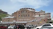 The present church was built 1918 in the Byzantine Revival style. Its design is inspired by the Hagia Sophia in Istanbul, Turkey. It is an approximately two-story brick building topped by a large dome surrounded by a series of smaller domes.[5] The designs was credited to Gustave Steinback and his noted ecclesiastical architectural firm by the AIA Guide to NYC (1978) and according to Steinback's own claim to the American Institute of Architects for its registry filings.[2] However, the AIA Guide to NYC (2010) has revised the architect of the design to Anton Kloster.[3] Other guides have also attributed the work to Kloster.[6][7] It is possible that Kloster worked for Steinback at the time.