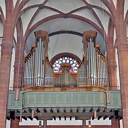 An organ was built in 1954 by Orgelbau Romanus Seifert & Sohn. In 1985 the instrument was expanded by Hugo Mayer Orgelbau; in 1995 three electronic bass stops were added.[1] The Kantor was Gabriel Dessauer from 1981, the conductor of the 120-member Chor von St. Bonifatius, founded in 1862, the children's choir Kinderchor von St. Bonifatius, and the Schola for Gregorian chant. He was succeeded by Roman Twardy. The church choir sings at services, including regular orchestral masses of Haydn, Mozart, Beethoven and Schubert for Christmas and Easter. Every year, typically on 3 October, a choral concert is performed. Other annual features are choral and organ concerts organised around a theme, called Boni-Musikwochen, including concerts of organists such as Kent Tritle and Ignace Michiels, and the project choir Reger-Chor. On 7 November 2015, as part of the 21st festival Wiesbadener Bachwochen, the church presented a concert dedicated to French church music, Gabriel Fauré's Cantique de Jean Racine and Requiem and Olivier Latry's Salve Regina. A project choir of 150 singers performed, led by three conductors of the Diocese of Limburg, with soloists and members of the orchestra of the Hessisches Staatstheater Wiesbaden.[4]