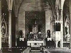 In 1892 the present rectory was built as a Franciscan monastery with 30 rooms plus a spacious attic. The previous rectory was located directly to the east of the church and needed to be moved to make way for an expansion of the church building. The parish then numbered about 100 families, fairly evenly divided between farmers, railroad people, and other business people. In 1894 the church was expanded, adding an apse and two transepts containing large stained-glass windows made by George A. Misch and Brothers of Chicago. The south window depicts the three patrons of the Franciscan order: St. Clare, St. Louis IX, King of France, and St. Elizabeth.[3] The north window shows the Holy Family of Jesus, Mary, and Joseph. The four stained-glass windows in the apse depict St. Francis receiving the stigmata, the Annunciation, the child Jesus appearing to St. Anthony, and St. Margaret Mary Alacoque receiving the devotion to the Sacred Heart. Much of the statuary dates back to the late 19th century and was manufactured in Munich, Germany.[4]: 55