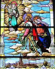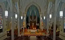The church is a Gothic Revival structure, built in the shape of a Latin cross.[3]:225 Its exterior consists of brick walls and a gabled roof, upheld by a stone foundation. The most prominent aspect of its exterior is a massive belfry and clock tower,[2] approximately 200 feet (60 m) tall.[3]:226 Large rose windows illuminate the interior,[2] which features painted and frescoed walls; the distance from the floor to the apex of the ceiling vault is 62 feet (19 m).[3]:226 The exterior design is similar to two other churches by Adolphus Druiding; St. Patrick (1891) in Toledo, OH and St. Michael (1890) in Rochester, NY. A major renovation project in the 1970s led to significant changes in the sanctuary, including the removal of frescoes by Austrian-born artist, Joseph Vittur, statues and its High Gothic altar.[2], designed by the E.Hackner Co., LaCrosse, WI.