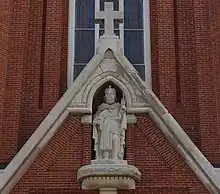 Granite statue of Saint Henry II, Holy Roman Emperor, above the main portal by sculptor Herman Brockmann of Cincinnati