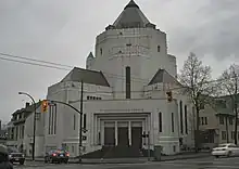 The present (and third) church building was designed by Adrian Gilbert Scott[5] who later designed the Church of St. Mary and St. Joseph, Poplar, London, England which has architectural similarities. The building is the second to be built at this location on land (east of Main Street) donated by the Canadian Pacific Railway after the fire. Its design is a combination of Art Deco, Romanesque Revival, Byzantine Revival, and Gothic Revival architecture.[6] The walls are made of reinforced concrete,[7] while the roof is made of slate.[8] The building was constructed between 1935 and 1937 and consecrated in 1938.