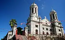 The present cathedral with its imposing white twin towers was built on a fossilized reef, in 1845, and is now in its third incarnation, as earthquakes in 1683 and in 1745 destroyed the previous structures. The iron gates on the south face of the church are flanked by pillars displaying Biblical statues of St John the Divine and St John the Baptist. They were reportedly taken in 1756 from a French ship destined for Martinique.[2][3][4][5]