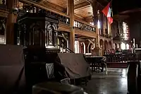 According to the first 1846 edition of The Church of England Magazine, the current church is 156 feet (48 m) long and 46 feet (14 m) wide.[7] The length of the transept is 104 feet (32 m).[7] The building is made from freestone, with stained glass windows and dark pitch pine furnishings.[7] A unique feature in the cathedral is the pitch pine interior structure and cladding to provide lateral reinforcing for earthquake or hurricane loads. As a result that the cathedral is known by the epithet "a building within a building." The cathedral has two 70 feet (21 m) high towers built in baroque style of architecture with cupolas topping them, described as "slightly awkward,"[6] and are painted in an aluminum color. This design had invited derision when built as representing "a pagan temple with two dumpy pepper pot towers", while now it is extolled as the best cathedral in the West Indian province.[2][3] The interior decor of the church is dominated by dark pine furnishings and marble tablets on the walls, some of them were salvaged after earthquakes from the old churches that stood on the spot.[6]