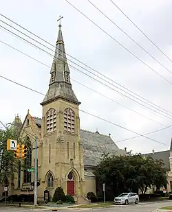 St. John's Episcopal Church is a High Victorian Gothic structure made of yellow brick. The steeply pitched gable roof is clad with grey and yellow slate, and the windows make extensive use of stained glass. Two towers, a lower squared one and a teller hexagonally roofed one, balance the facade. Additional exterior moldings, tracery, and carvings provide details to the facade. Porticoes, buttresses, and gothic arched windows give the church a Gothic look.[2]