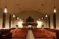 The interior of the nave is covered by a barrel-vaulted ceiling and is lit by five large stained glass windows on each side. The chancel dado is paneled and covered by a rib vaulted ceiling over the three-sided apse. The vaults are decorated by frescoes. The first and third panels of the apse are covered with mosaic panels, framing the central panel which contains a stained glass window.[7]