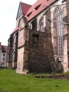 The church was almost destroyed by Allied bombing on 22 March 1945. It had already suffered significant damage to the choir's roof and windows in February of that year, but the latter air-raid razed all but the base of the tower and some remnants of the nave's walls. A rebuilding program, sponsored by the Protestant Church, was completed in 1952. However, a southern annex, dating from 1482, was left in ruins as a memorial monument. The tower was left with a provisional roof, but was given a new spire in 2007.[3][4]